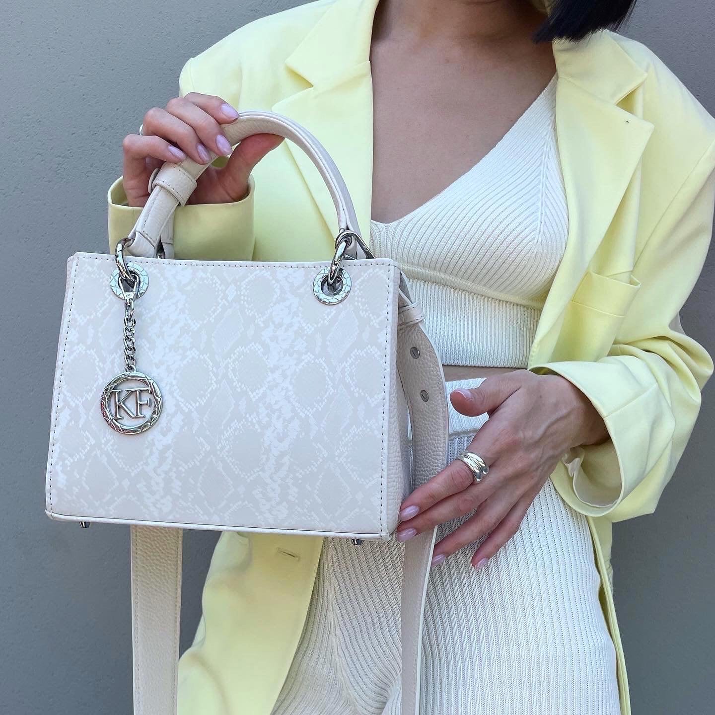 Delivery: In most cases, our goods are shipped by FedEx or Ups Express. On rare occasions, the goods might be shipped by Ukrposhta. The clients should check in advance an estimate of the amount of customs duty and value added tax. Light beige genuine leather handbag with snake print from Ukrainian designer Katerina Fox. This model is designed for women who appreciate the sleek design combined with functionality and comfort. High-quality and reliable hardware ensure long service bags. Inside the bag are three spacious compartments, one with zip, two patch pockets and one zippered pocket closes with a zipper. The bottom of the bag protected by metal feet.